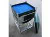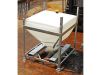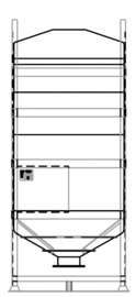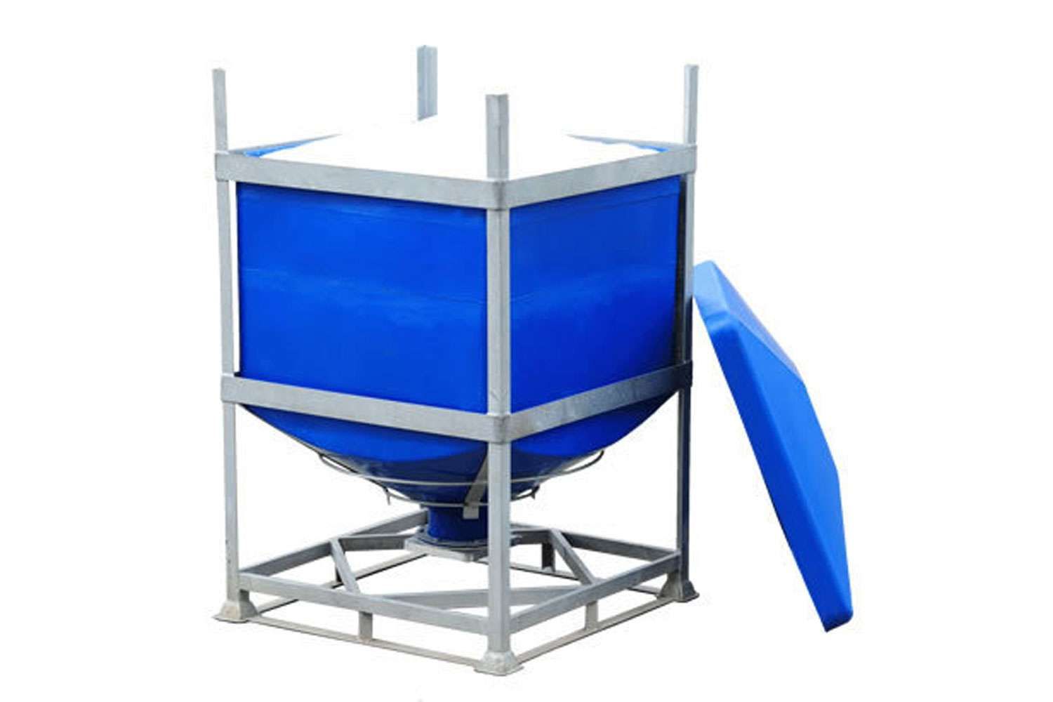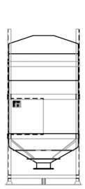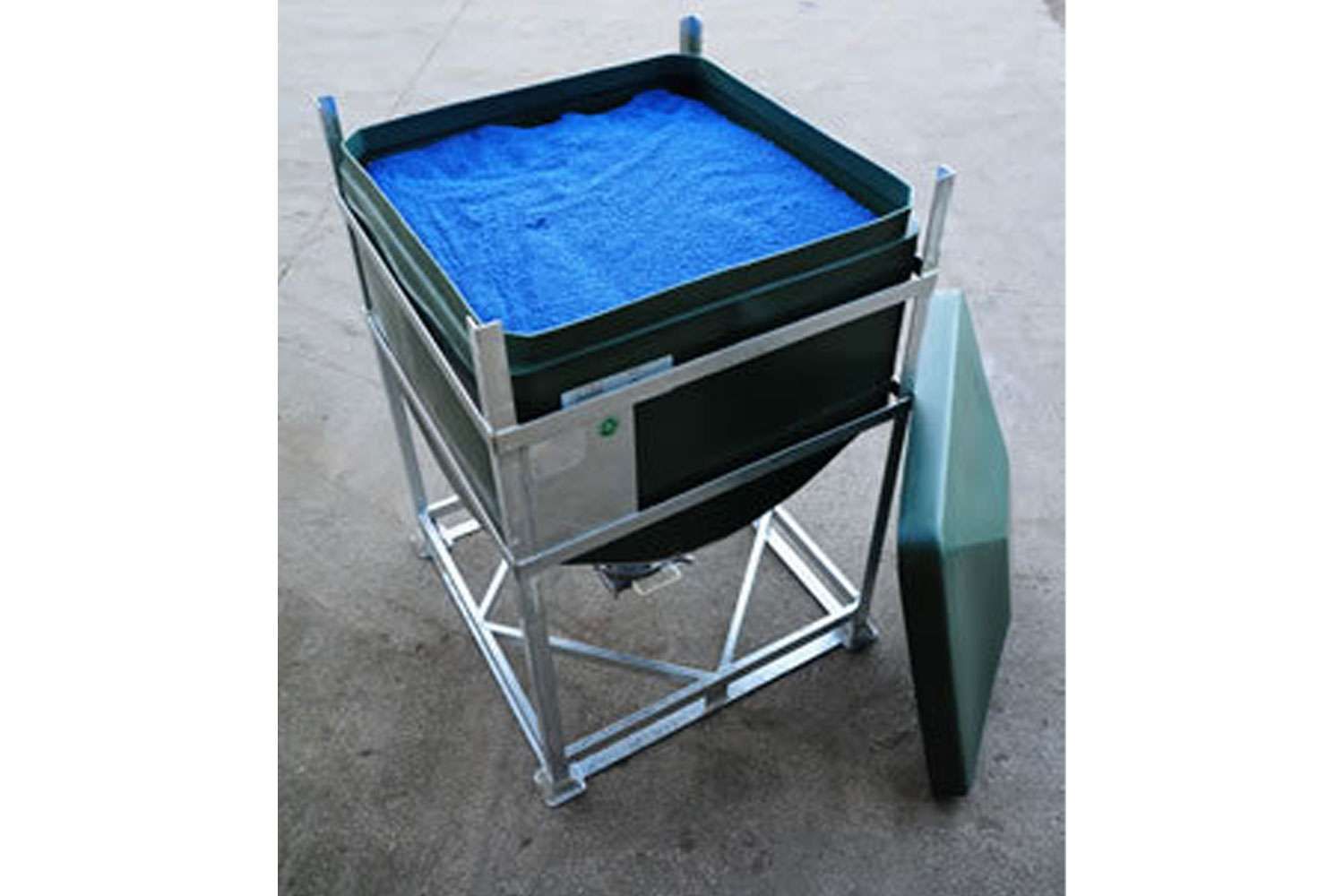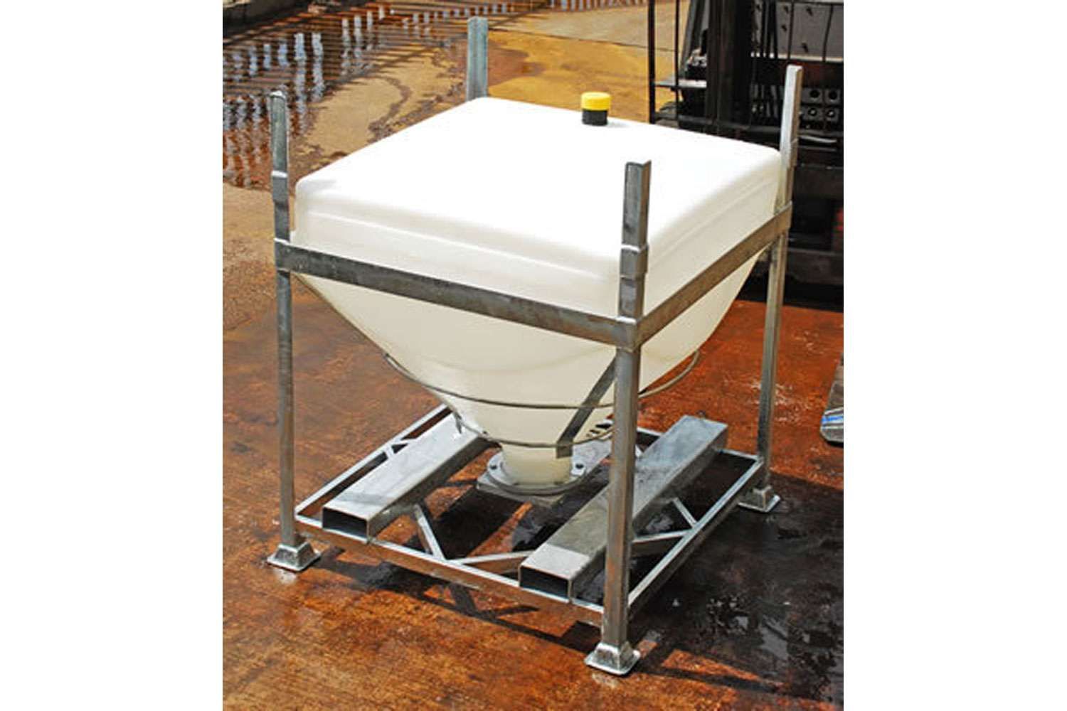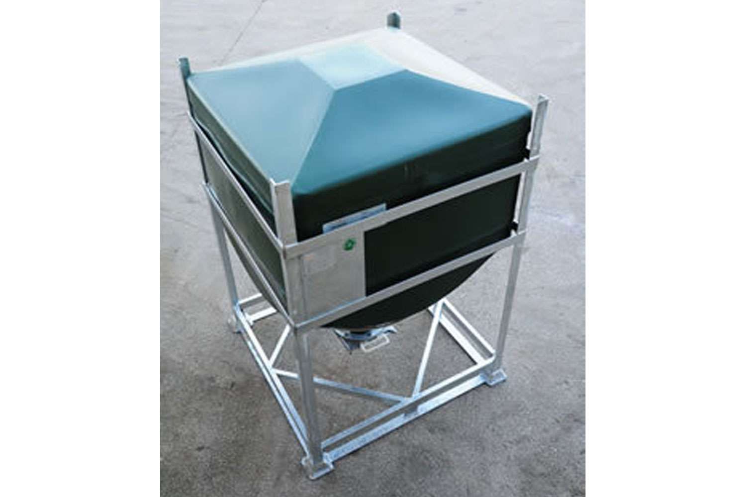 The DGC liner is rotationally moulded in natural UV stabilised linear medium density polyethylene. The polymer has strong resistance to industrial wear and tear. The conical base has a 120°cone angle which is designed to provide total discharge of the contents. The liner is supported and protected by a galvanised mild steel frame, providing excellent resistance to the elements. The base of the frame has integral four way fork truck entry.
